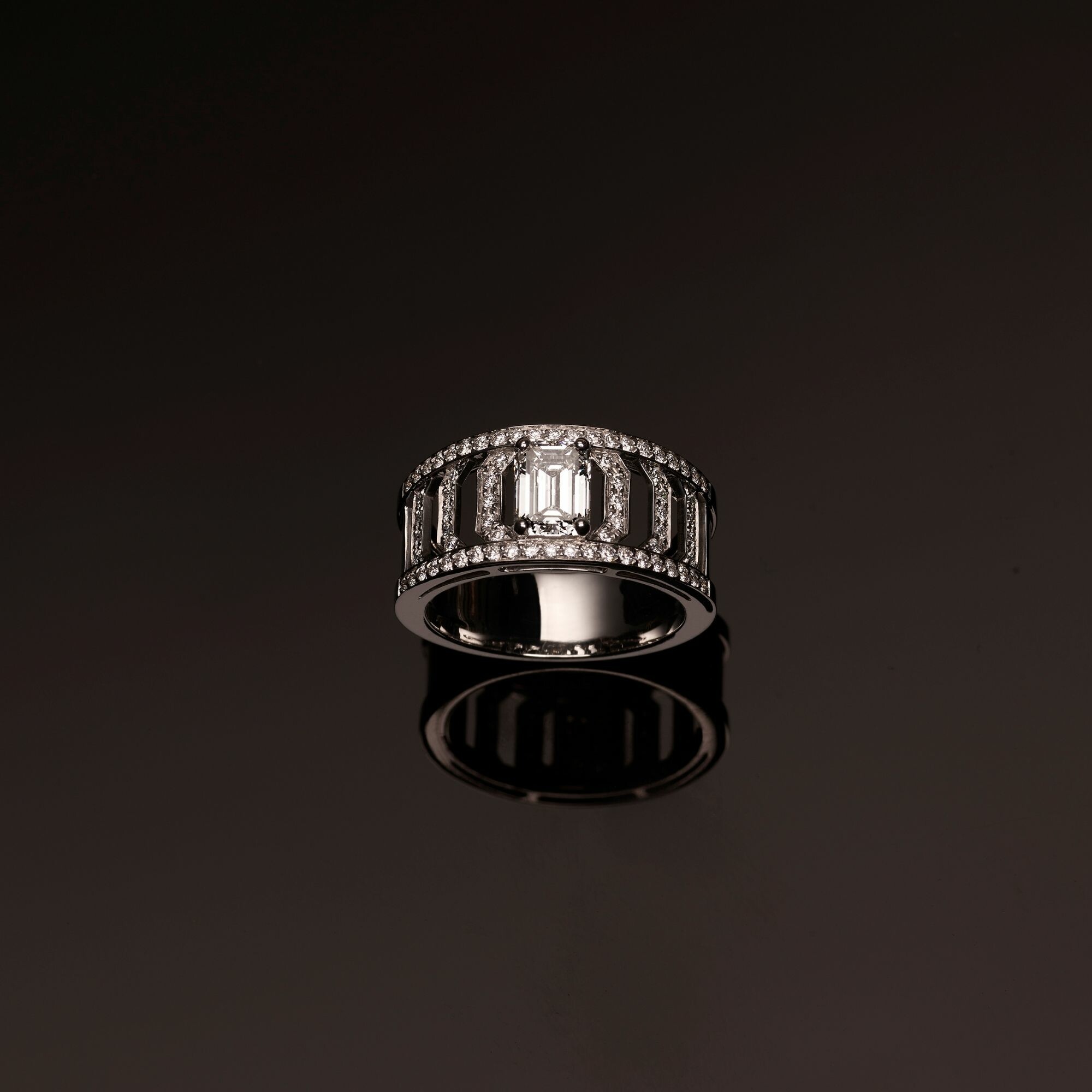 Bague Alcazar en or blanc, diamant taille émeraude et diamants. Les prix sont à titre indicatif. Ils varient en fonction du cours de l'or et des pierres. Davantage de produits en boutique.
