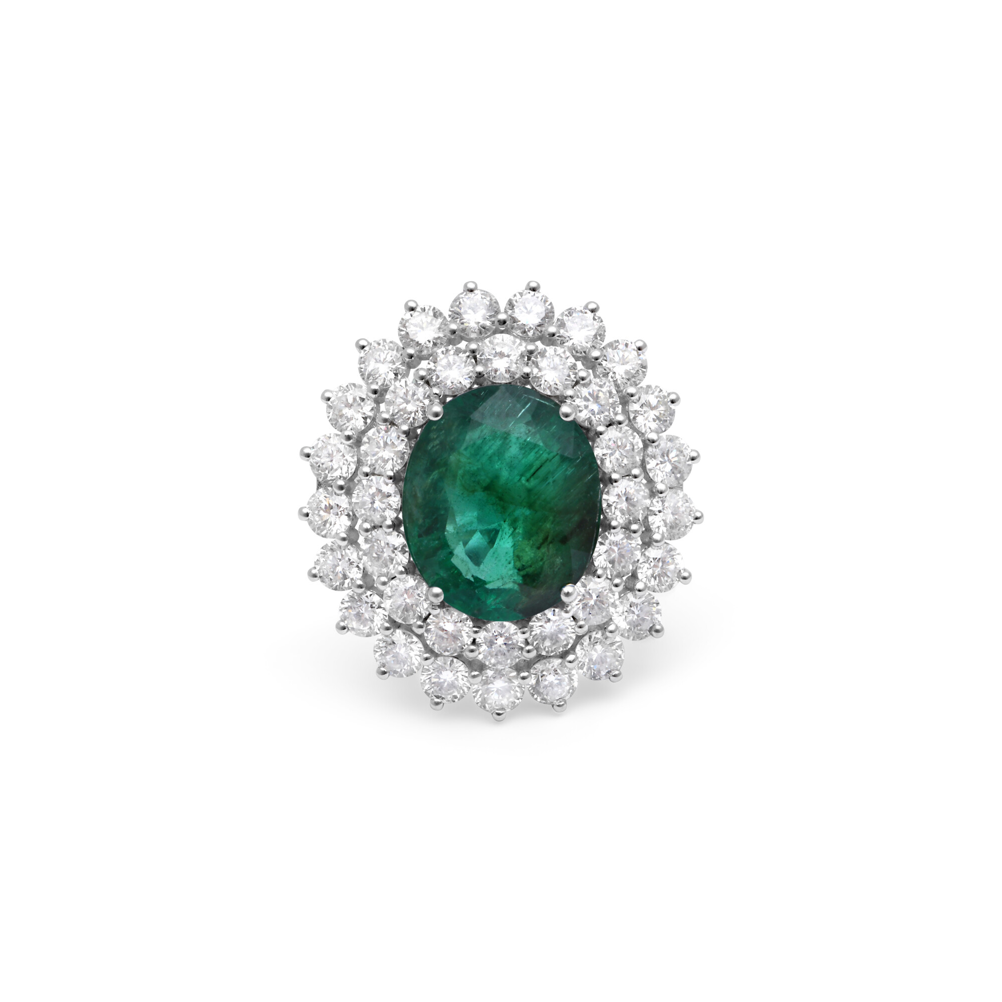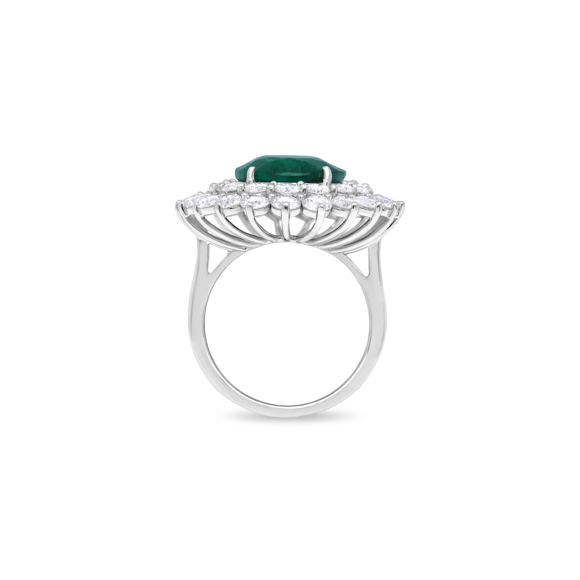 Bague cocktail Palm Spring en or blanc, émeraude taille ovale et double entourage diamants.