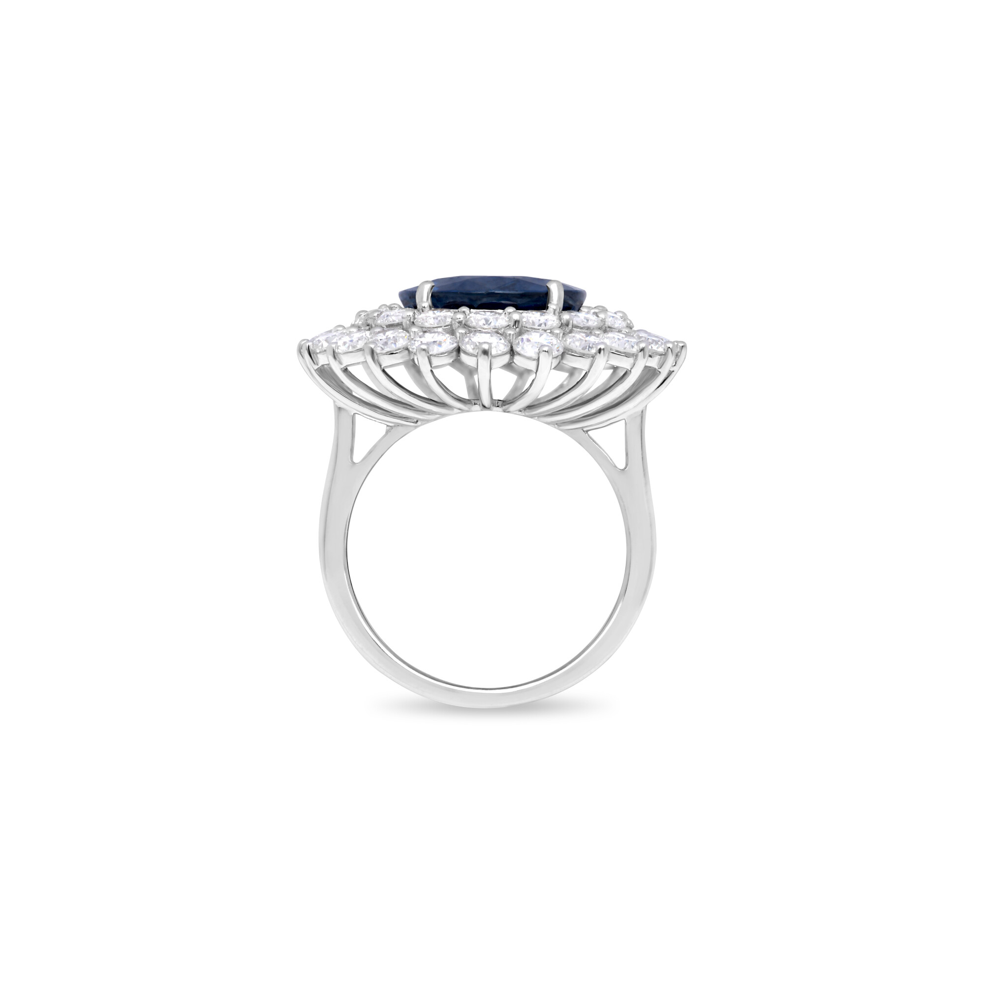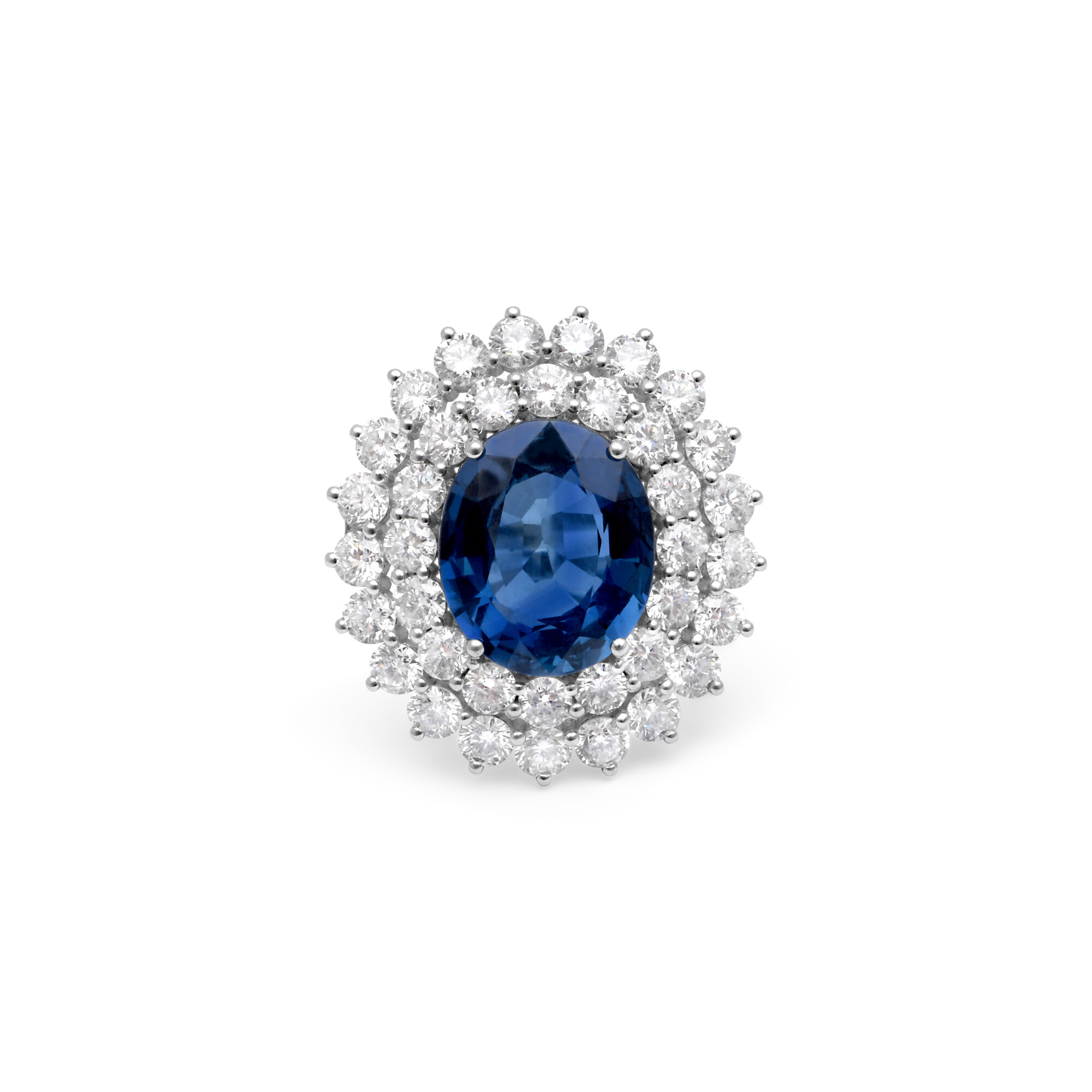 Bague cocktail Palm Spring en or blanc, saphir taille ovale et double entourage diamants.
